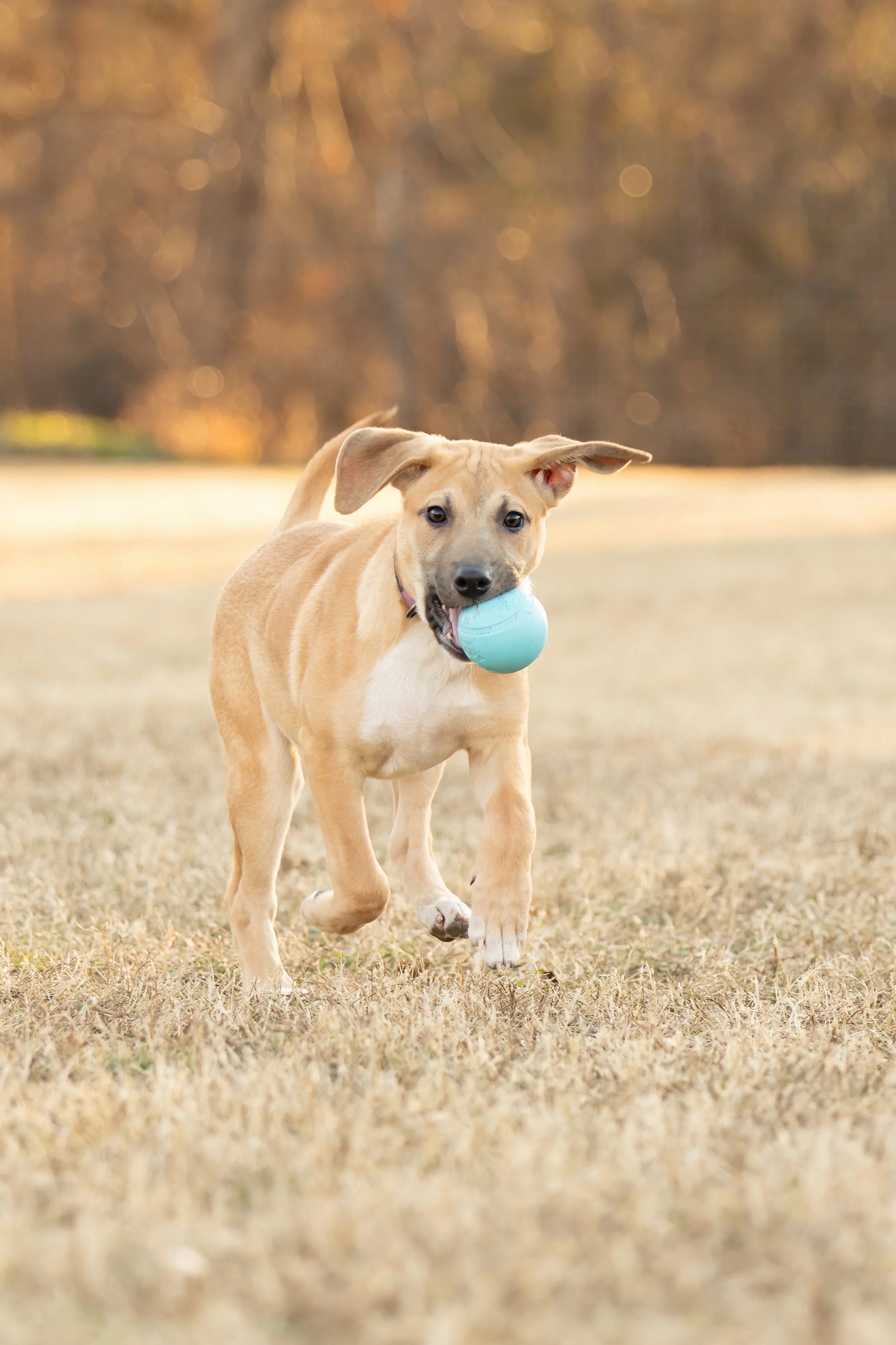 Adorable puppy romping with her ball.